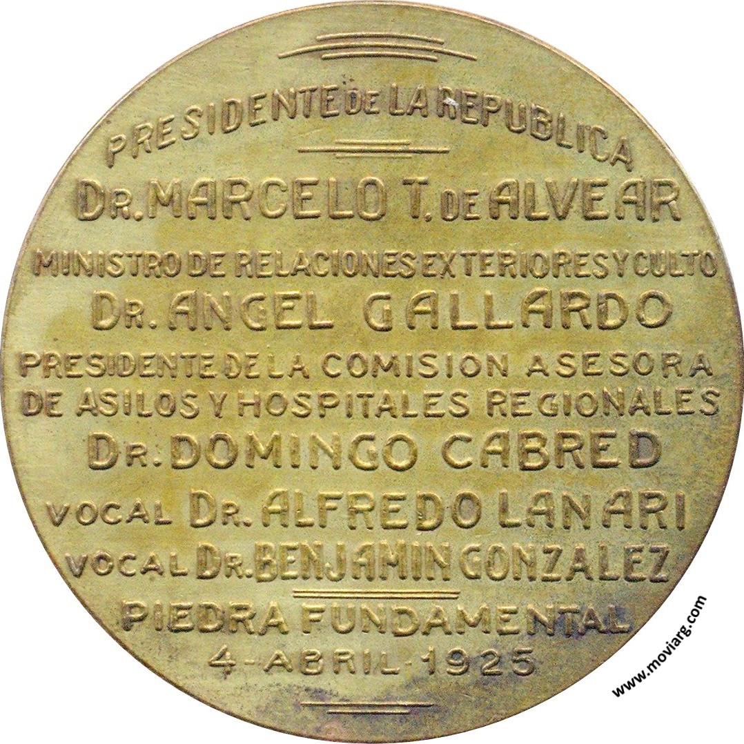 Anverso: POLICLINICO REGIONAL DEL LITORAL JUSTO JOSE DE URQUIZA - CONCEPCION DEL URUGUAY / LEY 4953. Firma: HORTA Reverso: PRESIDENTE DE LA REPUBLICA / DR. MARCELO T. DE ALVEAR / MINISTRO DE RELACIONES EXTERIORES Y CULTO / DR. ANGEL GALLARDO / PRESIDENTE DE LA COMISION ASESORA / DE ASILOS Y HOSPITALES REGIONALES / DR. DOMINGO CABRED / VOCAL DR. ALFREDO LANARI / VOCAL DR. BENJAMIN GONZALEZ / PIEDRA FUNDAMENTAL / 4 - ABRIL - 1925 Referencia: | |