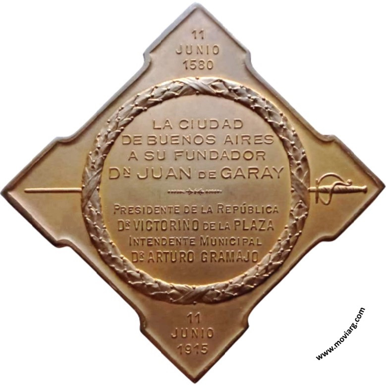 Anverso: Firma: CONSTANTE ROSSI Reverso: 11 / JUNIO / 1580 / LA CIUDAD / DE BUENOS AIRES / A SU FUNDADOR / DN JUAN DE GARAY / PRESIDENTE DE LA REPÚBLICA / DR. VICTORINO DE LA PLAZA / INTENDENTE MUNICIPAL / DR. ARTURO GRAMAJO / 11 / JUNIO / 1915 Referencia: | |