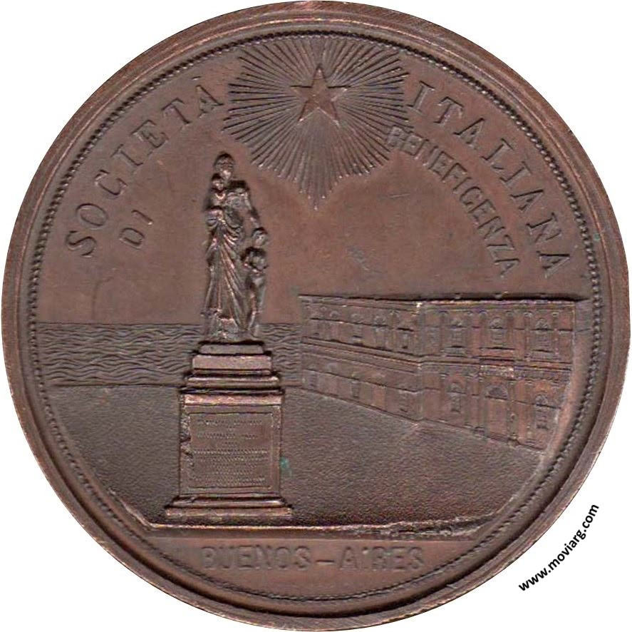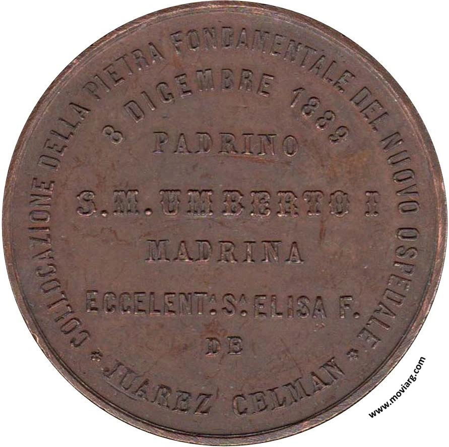 Anverso: SOCIETÁ / ITALIANA / DI / BENEFICENZA / BUENOS-AIRES Reverso: COLLOCAZIONE DELLA PIETRA FONDAMENTALE DEL NUOVO OSPEDALE / 8 DICEMBRE 1889 / PADRINO / S. M. UMBERTO I / MADRINA / ECCELENTA. SA. ELISA F. / DE / JUAREZ CELMAN Referencia: | |