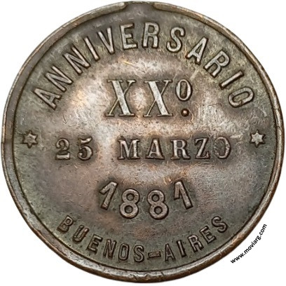 Anverso: SOCIETÁ NAZIONALE ITALIANA Reverso: ANNIVERSARIO / XX° / 25 MARZO / 1881 / BUENOS-AIRES Referencia: | |