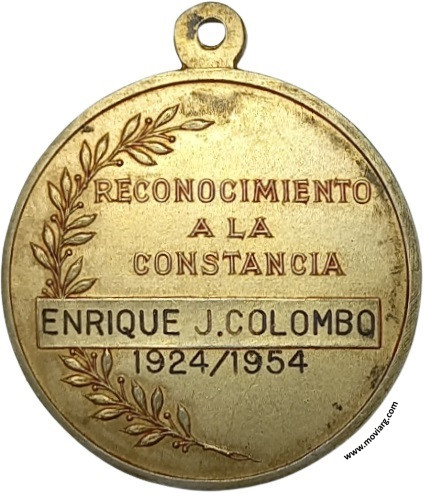 Anverso: REPUBLICA ARGENTINA / MINISTERIO DE MARINA Reverso: RECONOCIMIENTO / A LA / CONSTANCIA / [ ENRIQUE J. COLOMBO ] / [ 1924/1954 ] Canto: Liso. [ 900 ] Referencia: | |