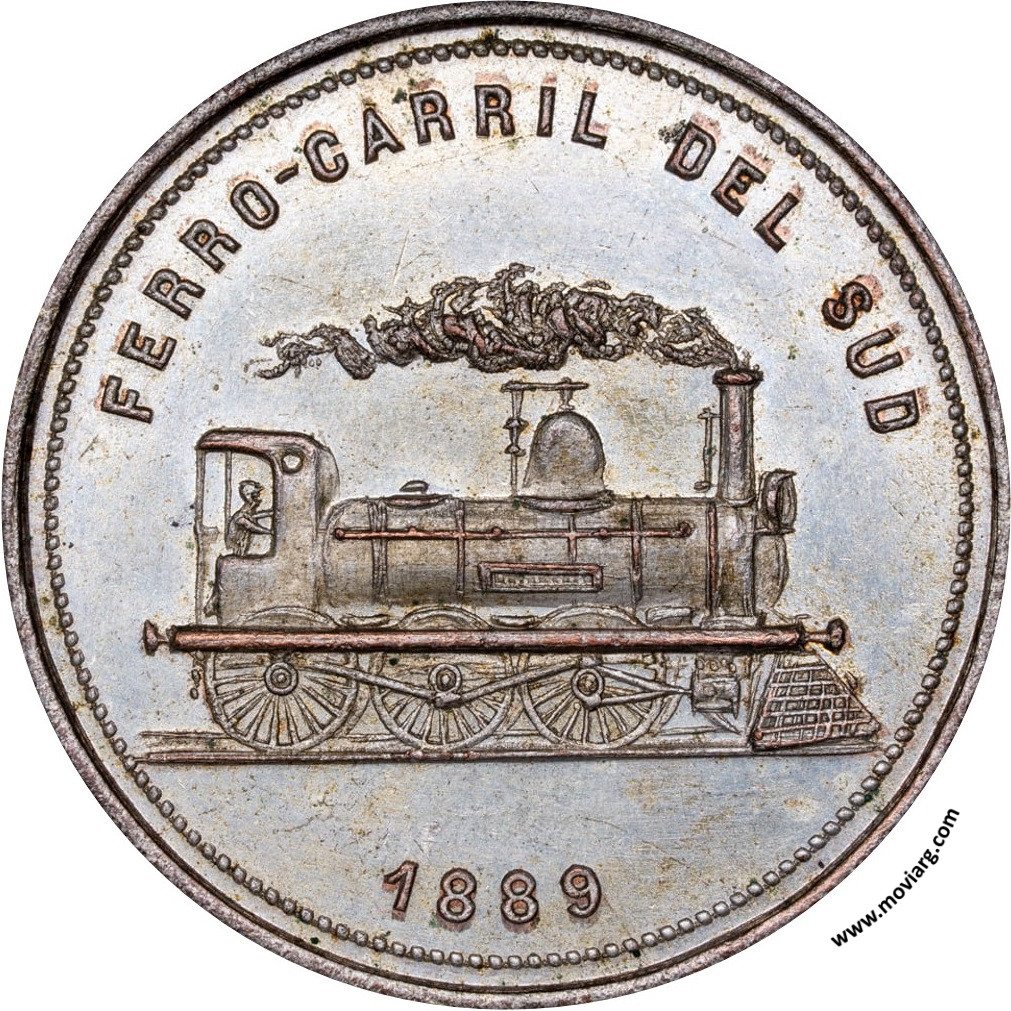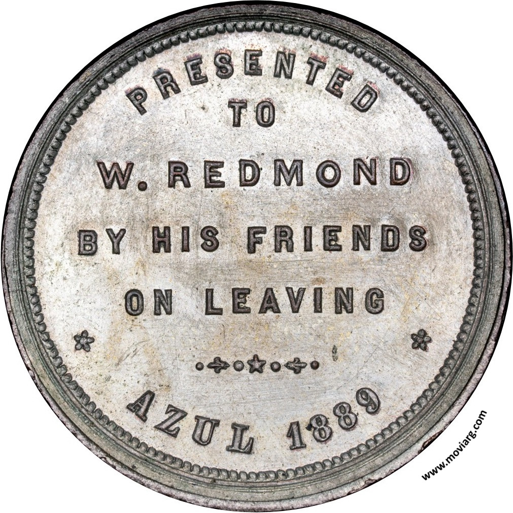 Anverso: FERRO-CARRIL DEL SUD / 1889 Reverso: PRESENTED / TO / W. REDMOND / BY HIS FRIENDS / ON LEAVING / AZUL 1889 Referencia: | |