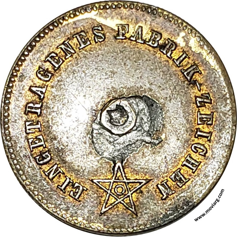 Anverso: REPUBLICA DEL URUGUAY Reverso: EINGETRAGENES FABRIK-ZEICHEN Canto: Estriado recto. Nota Moviarg: Esta pieza seguramente ha sido acuñada para ser utilizada como botón pero en este caso parece que se la ha retirado la anilla/pin. Es por ello que figura como Token aunque es muy probable que aparezca otra pieza con la correspondiente soldadura. Referencia: | |