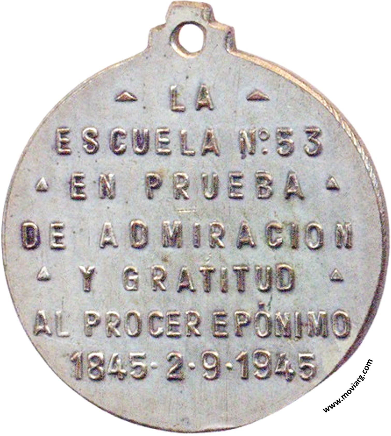 Anverso: BERNARDINO RIVADAVIA. Firma: O. GALLO Reverso: LA / ESCUELA N° 53 / EN PRUEBA / DE ADMIRACION / Y GRATITUD / AL PROCER EPÓNIMO / 1845 · 2 · 9 · 1945 Referencia: | |