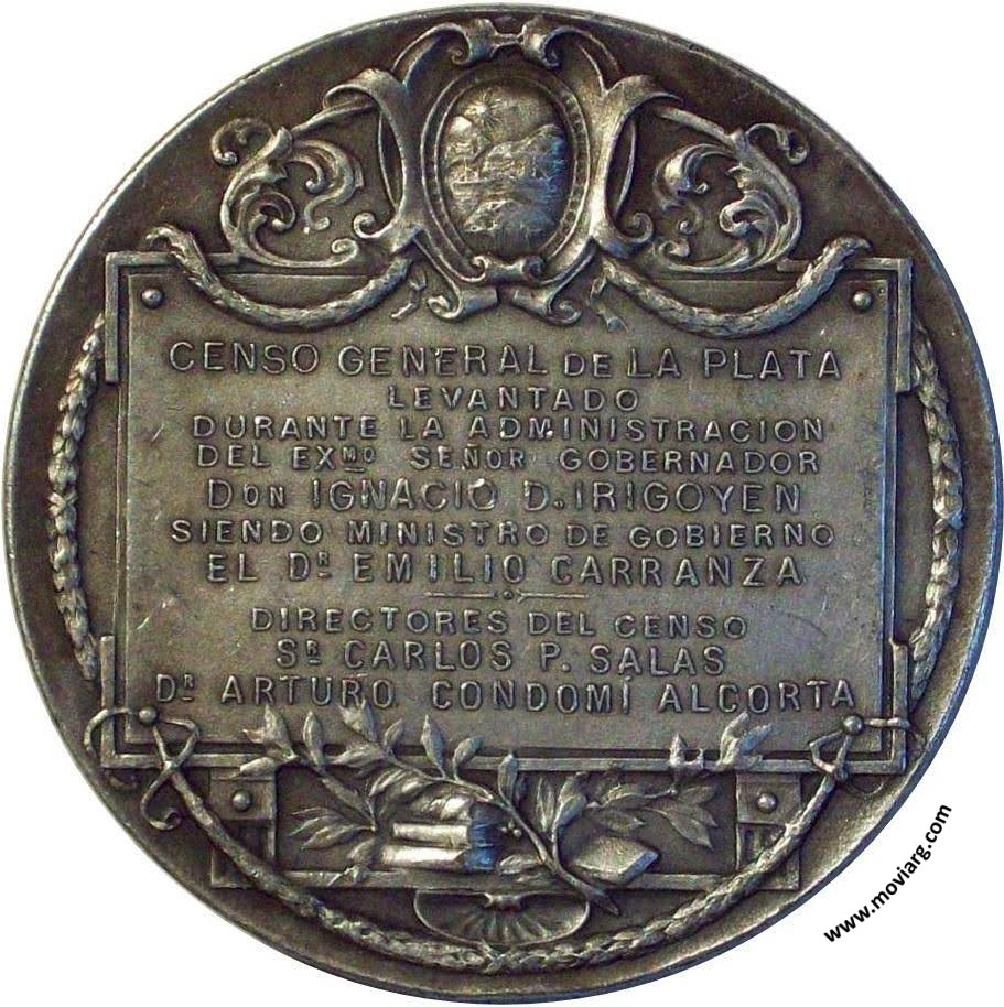 Anverso: MAYO / DE / 1909. Firma: J. GOTTUZZO Y CA. Reverso: CENSO GENERAL DE LA PLATA / LEVANTADO / DURANTE LA ADMINISTRACION / DEL EXMO. SEÑOR GOBERNADOR / DON IGNACIO D. IRIGOYEN / SIENDO MINISTRO DE GOBIERNO / EL DR. EMILIO CARRANZA / DIRECTORES DEL CENSO / SR. CARLOS P. SALAS / DR. ARTURO CONDOMÍ ALCORTA Referencia: | |