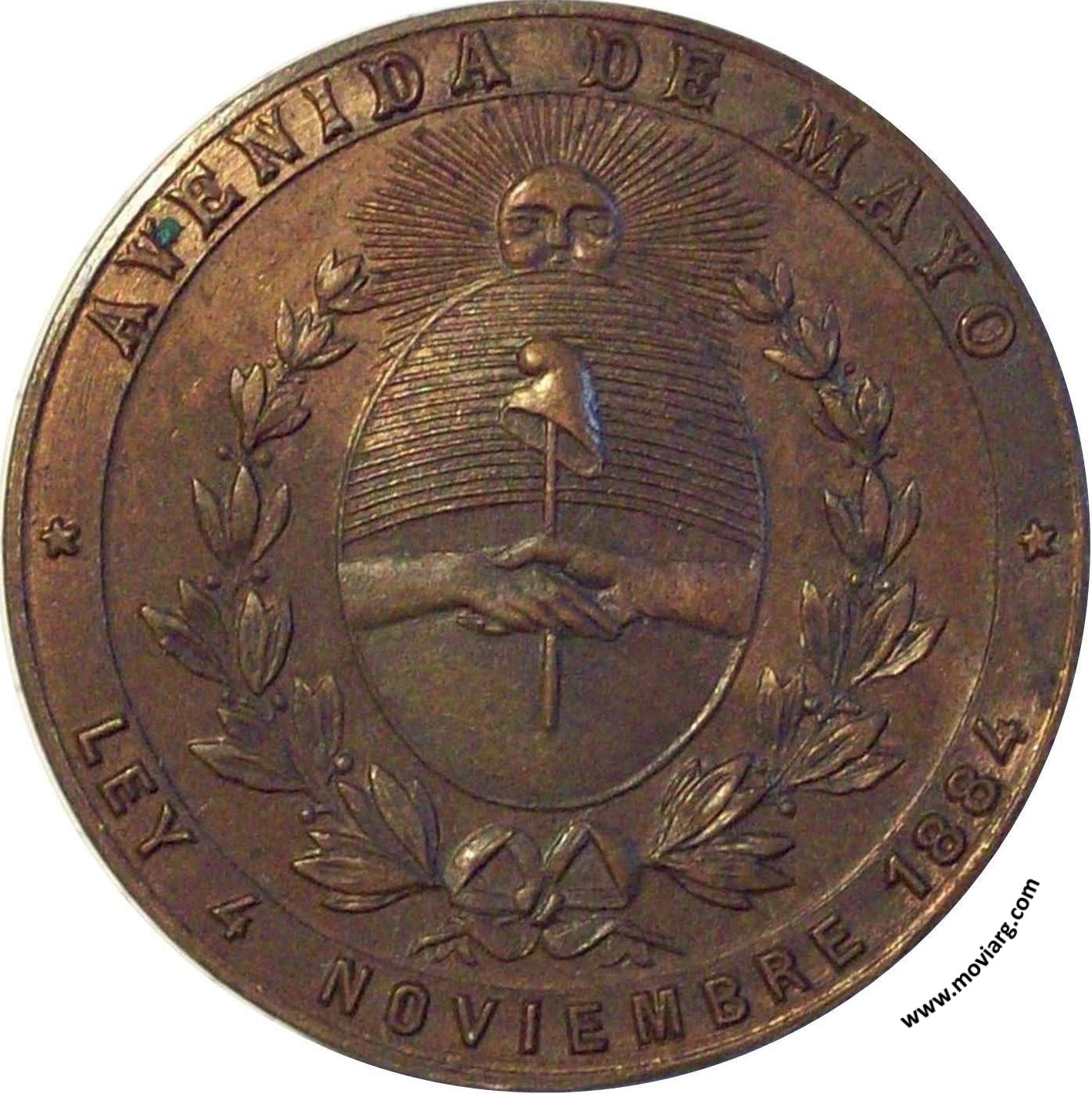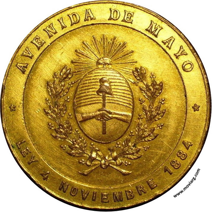 Anverso: AVENIDA DE MAYO / LEY 4 NOVIEMBRE 1884 Reverso: LIBRADA AL SERVICIO PÚBLICO / 9 DE JULIO 1894. Firma: TALLER NACIONAL Referencia: BURZIO-433 ROSA-/145 | |