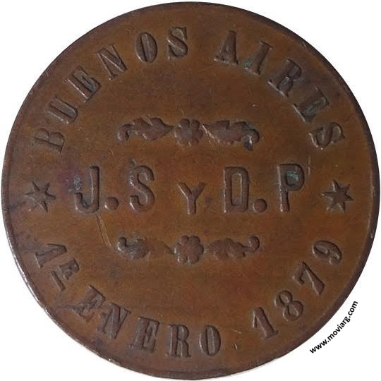 Anverso: SKATING RINK / ESMERALDA 149 / 5$ Reverso: BUENOS AIRES / 1R ENERO 1879 / J.S Y D.P Canto: Liso Referencia: | |