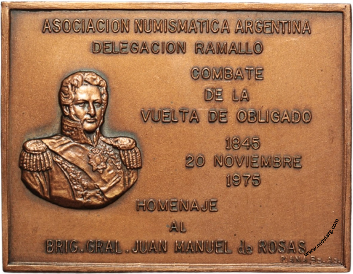 Anverso: ASOCIACION NUMISMATICA ARGENTINA / DELEGACION RAMALLO / COMBATE / DE LA / VUELTA DE OBLIGADO / 1845 / 20 NOVIEMBRE / 1975 / HOMENAJE / AL / BRIG. GRAL. JUAN MANUEL DE ROSAS. Firma: PIANA BS.AS. Reverso: Referencia: | |