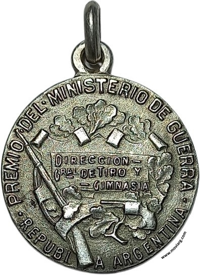 Anverso: Anilla: [ 800 ] Reverso: PREMIO DEL MINISTERIO DE GUERRA / REPUBLICA ARGENTINA / DIRECCION / GRAL. DE TIRO Y / GIMNASIA Canto: Liso. ARGENTINA Referencia: | |