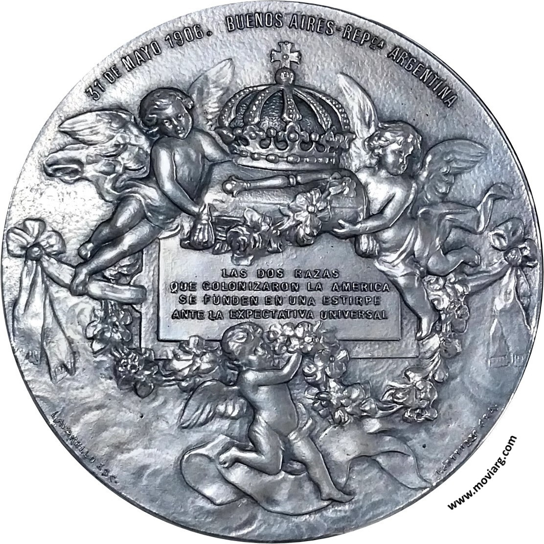 Anverso: ALFONSO XIII / VICTORIA. Campo: FORTITUDO ET DECOR / SEDERUNT SUPER IHRONUM Reverso: 31 DE MAYO 1906. BUENOS AIRES - REPCA. ARGENTINA / LAS DOS RAZAS / QUE COLONIZARON LA AMERICA / SE FUNDEN EN UNA ESTIRPE / ANTE LA EXPECTATIVA UNIVERSAL. Firma: LAVARELLO ESC. / J. GOTTUZZO GRA. Referencia: | |
