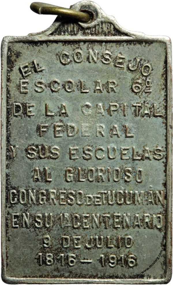 Anverso: LIBERTAD. Firma: C. ROSSI Reverso: EL CONSEJO / ESCOLAR 6° / DE LA CAPITAL / FEDERAL / Y SUS ESCUELAS / AL GLORIOSO / CONGRESO DE TUCUMÁN / EN SU 1R. CENTENARIO / 9 DE JULIO / 1816 - 1916 Referencia: | |