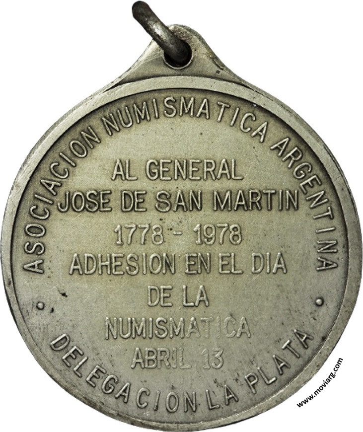 Anverso: Reverso: ASOCIACION NUMISMATICA ARGENTINA / AL GENERAL / JOSE DE SAN MARTIN / 1778 - 1978 / ADHESION EN EL DIA / DE LA / NUMISMATICA / ABRIL 13 / DELEGACION LA PLATA Referencia: | |