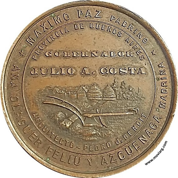 Anverso: MAXIMO PAZ PADRINO / ANA OLAGUER FELIU Y AZUENAGA MADRINA / PROVINCIA DE BUENOS AIRES / GOBERNADOR / JULIO A. COSTA / ARQUITECTO - PEDRO J. BENOIT Reverso: PIEDRA FUNDAMENTAL DEL CENTRO AGRICOLA URIBELARREA / 8 DE JUNIO 1890 / SU TEMPLO LEVANTADO POR / MIGUEL N. DE URIBELARREA / EN HOMENAJE A LAS VIRTUDES / DE SU FINADA ESPOSA / MANUELA OLAGUER FELIU / Y AZCUENAGA. Firma: J.D. Referencia: | |