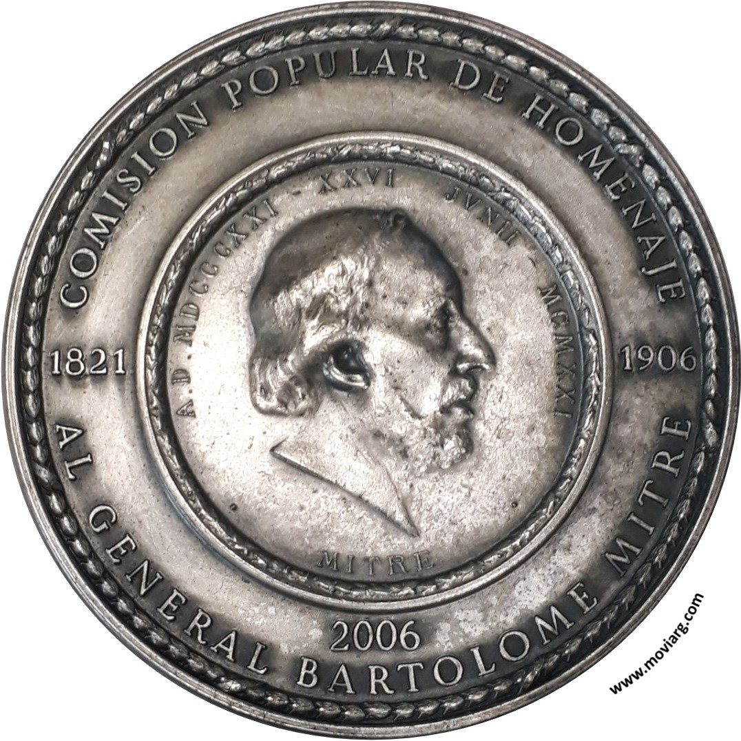 Anverso: COMISION POPULAR DE HOMENAJE / AL GENERAL BARTOLOME MITRE / 1821 / 1906 / 2006. Campo: A.D. MDCCCXXI - XXVI JVNII - MCMXXI / MITRE Reverso: NACIONALIDAD - UNION NACIONAL - LIBERTAD / EDUCACION - JUSTICIA. Campo: SPARGIT SEMINA QVÆ ALTERI SÆCVLO PROSINT. Firma: ARTE ESCULTORICO BS. AS. Firma: ROGELIO YRURTIA Referencia: | |