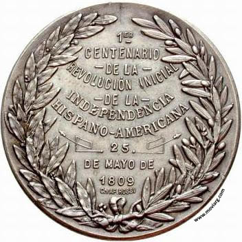Anverso: EXPOSICIÓN NACIONAL DE 1909 - SUCRE. Firma: C. Y AF. ROSSI / B. AIRES Reverso: 1ER. / CENTENARIO / - DE LA - / REVOLUCIÓN INICIAL / - DE LA - / INDEPENDENCIA / HISPANO-AMERICANA / 25. / DE MAYO DE / 1809. Firma: C. Y AF. ROSSI Referencia: | |