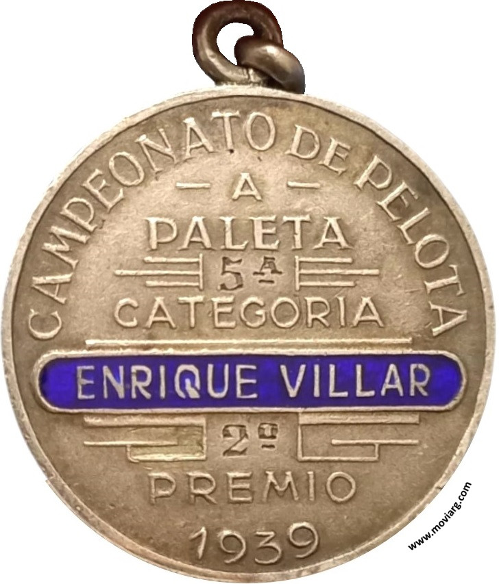 Anverso: FEDERACION ARGENTINA DE PELOTA / BUENOS AIRES. Campo: F. A. / D. PE. Reverso: CAMPEONATO DE PELOTA / A / PALETA / [ 5A. ] / CATEGORIA / [ ENRIQUE VILLAR ] / [ 2° ] / PREMIO / 1939 Referencia: | |
