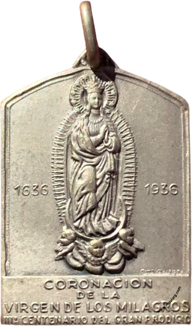 Anverso: 1936 / 1936 / CORONACION / DE LA / VIRGEN DE LOS MILAGROS / III° CENTENARIO DEL GRAN PRODIGIO. Firma: GOTTUZZO Y PIANA Reverso: IGLESIA / DE LA / COMPAÑIA DE JESUS / SANTA FE. Campo: [ ALPACA ] Referencia: | |