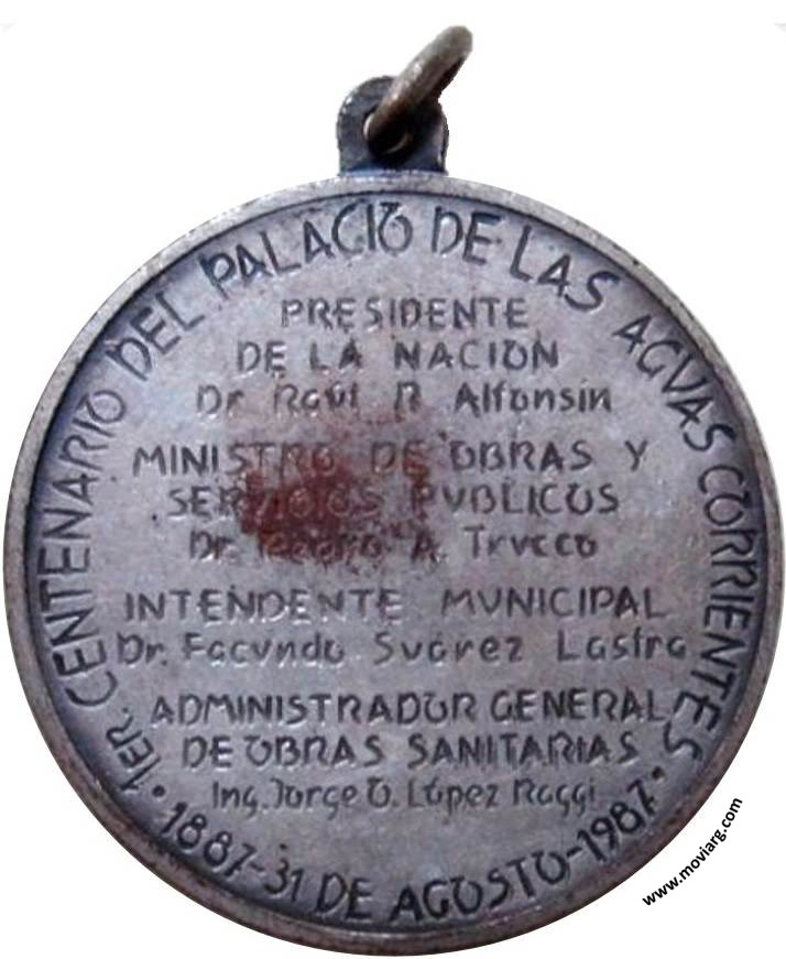 Anverso: BUENOS AIRES / ARGENTINA. Firma: ROBERTI Reverso: 1ER. CENTENARIO DEL PALACIO DE LAS AGUAS CORRIENTES / 1887 - 31 DE AGOSTO - 1987 / PRESIDENTE / DE LA NACION / DR. RAUL R. ALFONSIN / MINISTRO DE OBRAS Y / SERVICIOS PUBLICOS / DR. PEDRO A. TRUCCO / INTENDENTE MUNICIPAL / DR. FACUNDO SUAREZ LASTRA / ADMINISTRADOR GENERAL / DE OBRAS SANITARIAS / ING. JORGE D. LÓPEZ ROGGI Referencia: | |