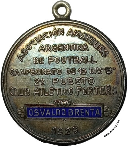 Anverso: Reverso: ASOCIACIÓN AMATEURS / ARGENTINA / DE FOOTBALL / CAMPEONATO DE 1A. DIV. "B" / 2° PUESTO / CLUB ATLÉTICO PORTEÑO / [ OSVALDO BRENTA ] / 1929 Canto: Liso. PLATA Referencia: | |