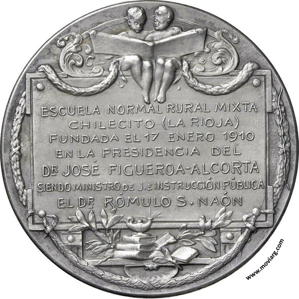 Nomisma Aste Anverso: NICOLÁS AVELLANEDAReverso: ESCUELA NORMAL RURAL MIXTA / CHILECITO ( LA RIOJA ) / FUNDADA EL 17 ENERO 1910 / EN LA PRESIDENCIA DEL / DR. JOSÉ FIGUEROA - ALCORTA / SIENDO MINISTRO DE J. É INSTRUCCIÓN PÚBLICA / EL DR. RÓMULO S. NAÓN Referencia: | |
