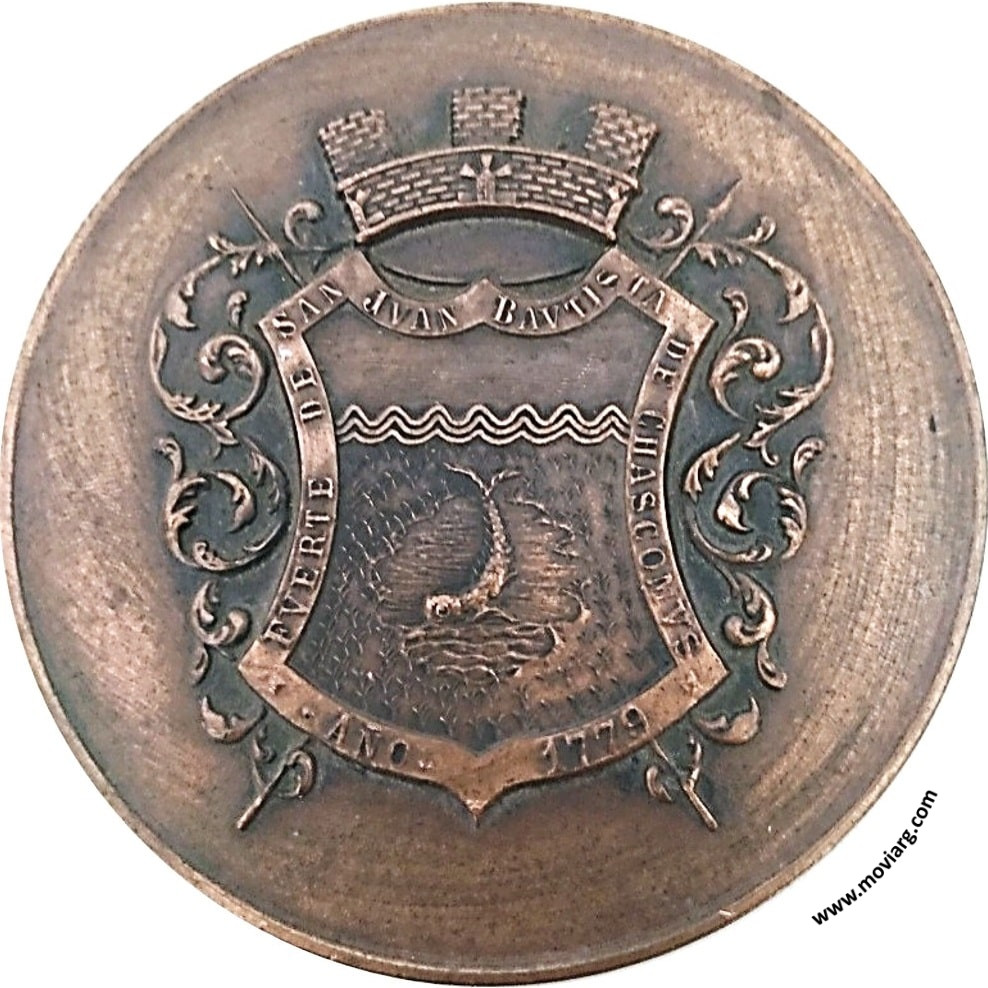 Anverso: Campo: FUERTE DE SAN JUAN BAUTISTA DE CHASCOMUS / AÑO 1779 Reverso: MUNICIPALIDAD DE CHASCOMUS / BI - CENTENARIO / DE LA CIUDAD FUNDADA / POR EL CAPITAN DE BLANDENGUES / DON PEDRO. N. ESCRIBANO / 1779 - 30 DE MAYO - 1979 / GOBERNADOR PROV. BS. AS. / GRAL. BR. (R) IBERICO M. SAINT JEAN / INTENDENTE / DE CHASCOMUS / DR. JOSE IGNACIO N. OCHOA Referencia: | |