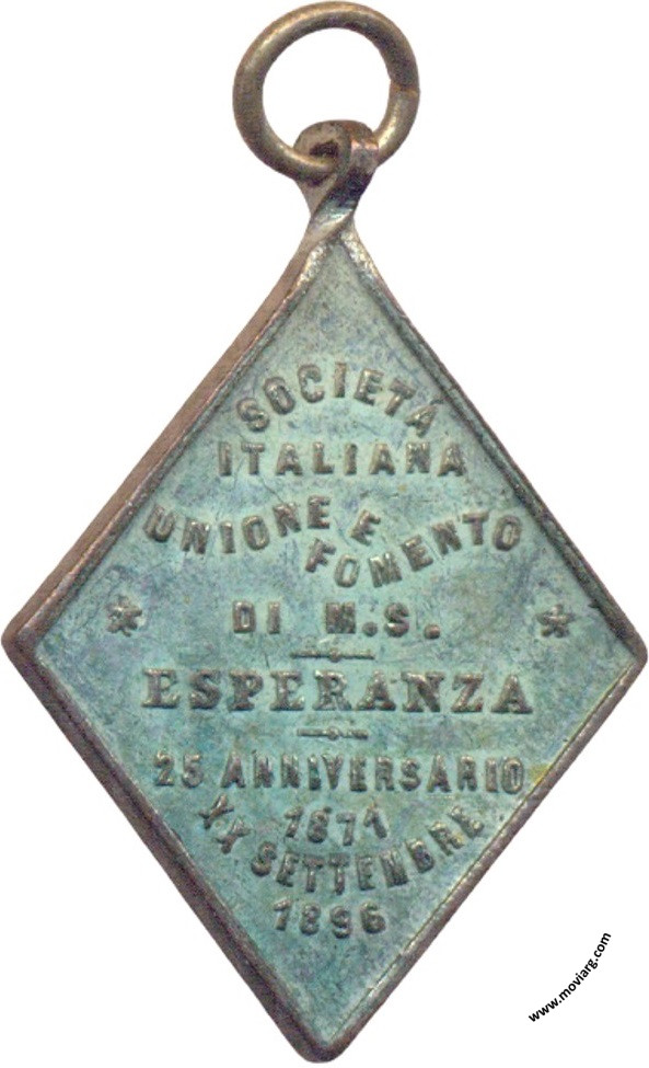 Anverso: Reverso: SOCIETÁ / ITALIANA / UNIONE E / FOMENTO / DI M.S. / ESPERANZA / 25 ANNIVERSARIO / 1871 / XX SETIEMBRE / 1896 Referencia: | |