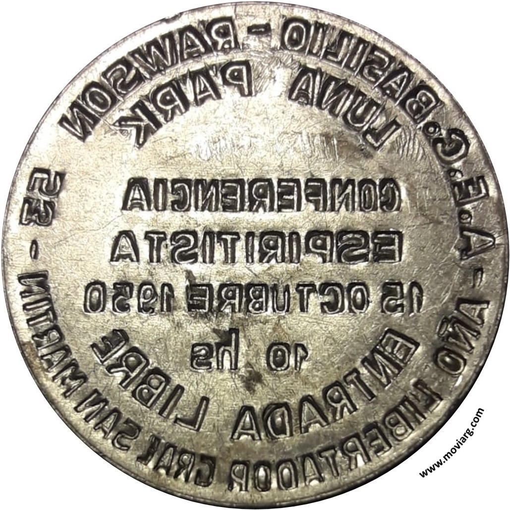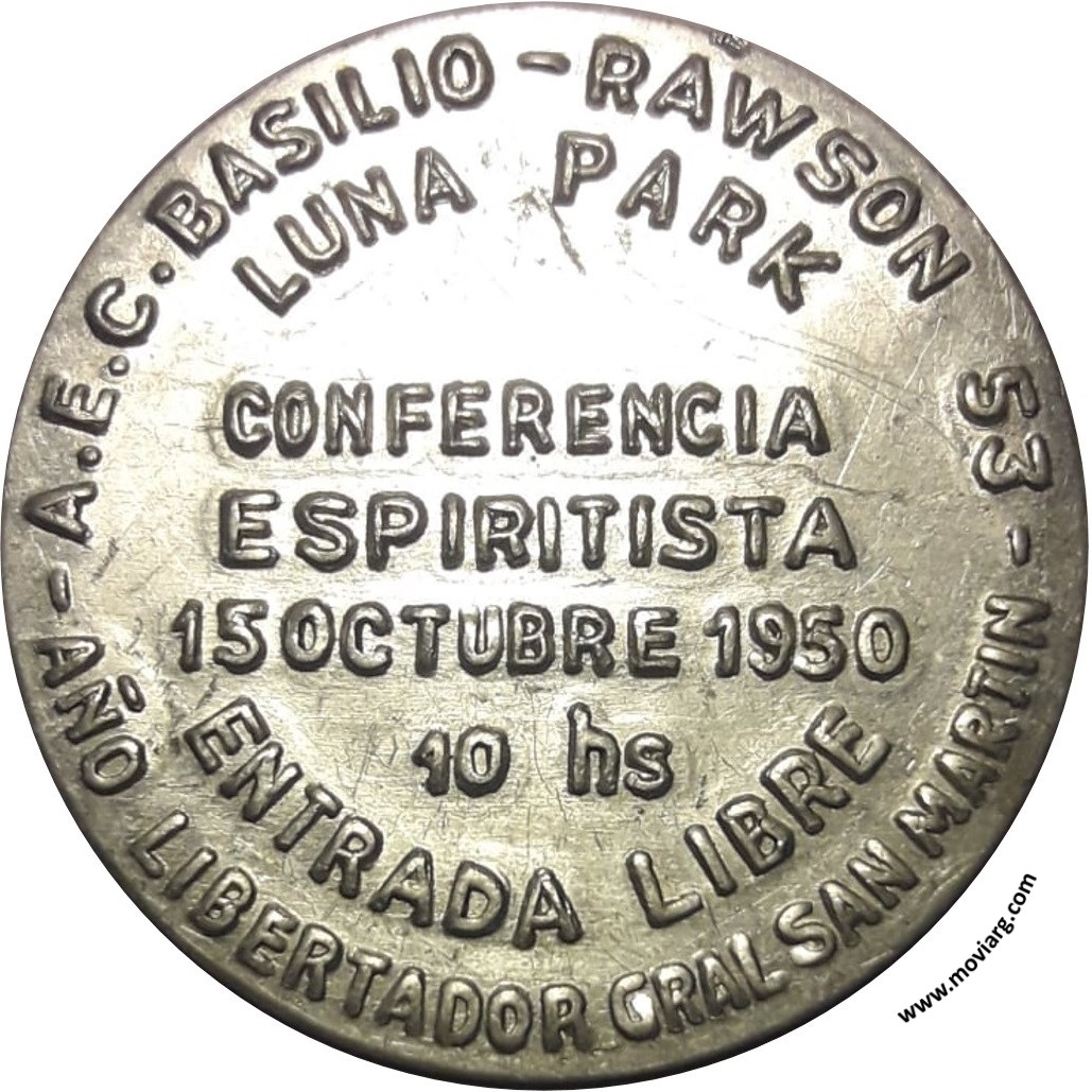 Anverso: A.E.C. BASILIO - RAWSON 53 / LUNA PARK / CONFERENCIA / ESPIRITISTA / 15 OCTUBRE 1950 / 10 HS / ENTRADA LIBRE / AÑO LIBERTADOR GRAL. SAN MARTIN Reverso: Referencia: | |