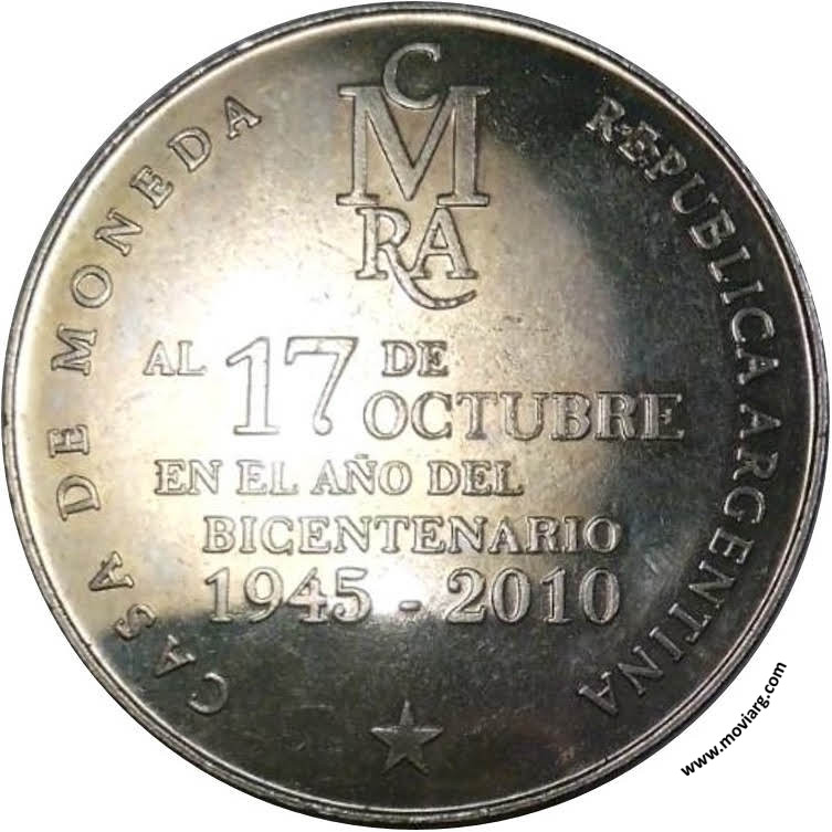Anverso: CASA DE MONEDA / REPUBLICA ARGENTINA / AL 17 DE / OCTUBRE / EN EL AÑO DEL / BICENTENARIO / 1945 - 2010. Campo: C / M / RA Reverso: S.E. CASA DE MONEDA / REPÚBLICA ARGENTINA Referencia: | |