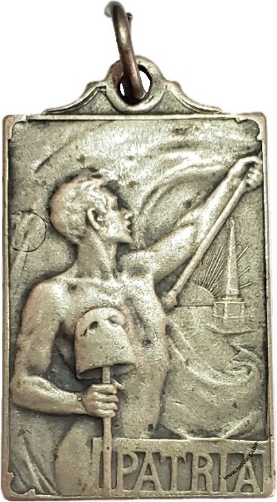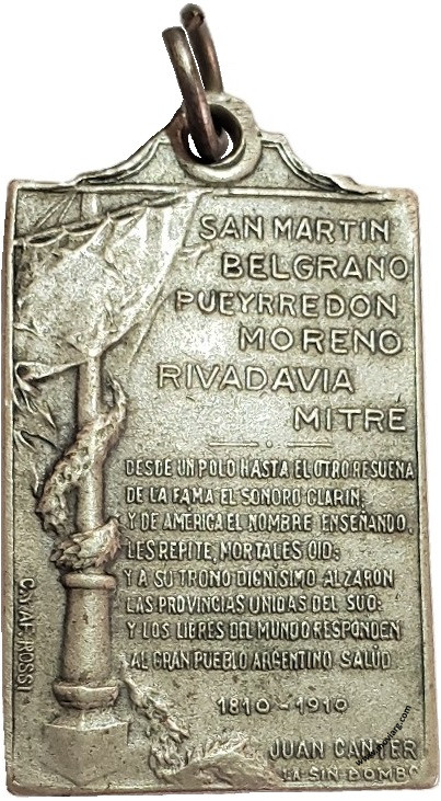 Anverso: PATRIA Reverso: SAN MARTIN / BELGRANO / PUEYRREDON / MORENO / RIVADAVIA / MITRE / DESDE UN POLO HASTA EL OTRO RESUENA / DE LA FAMA EL SONORO CLARIN; / Y DE AMÉRICA EL NOMBRE ENSEÑADO / LES REPITE, MORTALES OID: / Y Á SU TRONO DIGNÍSIMO ALZARON / LA PROVINCIAS UNIDAS DEL SUD: / Y LOS LIBRES DEL MUNDO RESPONDEN / AL GRAN PUEBLO ARGENTINO SALUD. / 1810 - 1910 / JUAN CANTER / LA SIN BOMBO. Firma: C. Y A.F. ROSSI Referencia: | |