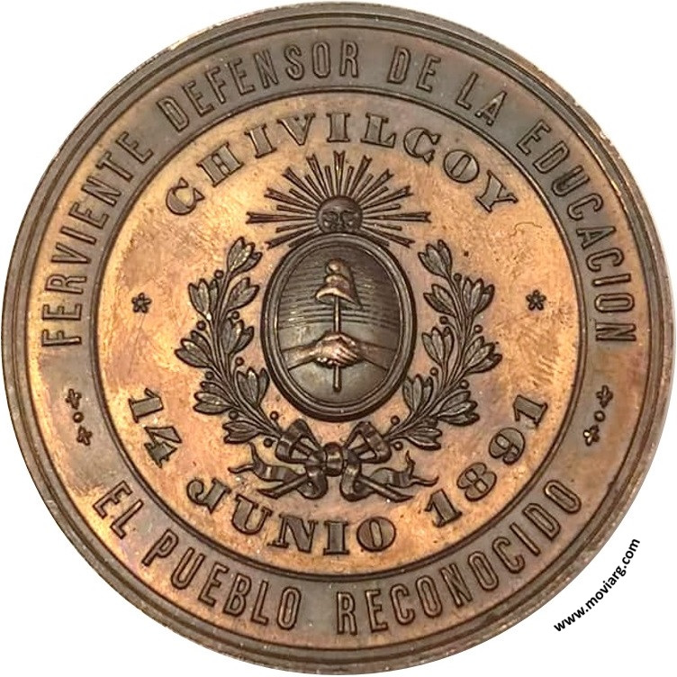Anverso: AL DR. SANTIAGO FORNOS / A LA VIRTUD Y AL TALENTO JUSTICIERO Reverso: FERVIENTE DEFENSOR DE LA EDUCACION / EL PUEBLO RECONOCIDO / CHIVILCOY / 14 JUNIO 1891 Referencia: | |
