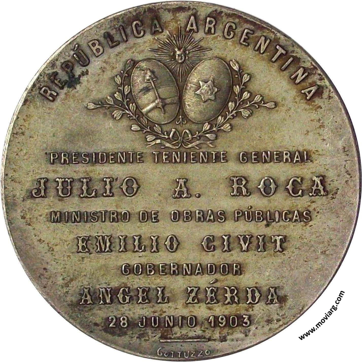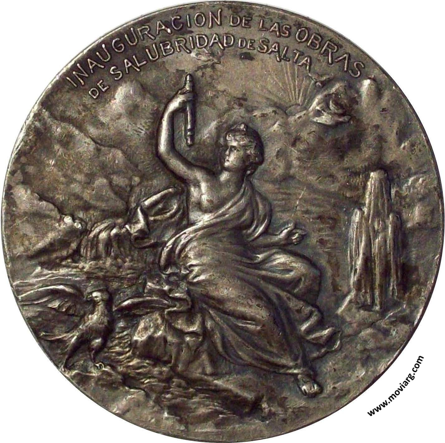 Anverso: INAUGURACION DE LAS OBRAS / DE SALUBRIDAD DE SALTA Reverso: REPÚBLICA ARGENTINA / PRESIDENTE TENIENTE GENERAL / JULIO A. ROCA / MINISTRO DE OBRAS PÚBLICAS / EMILIO CIVIT / GOBERNADOR / ANGEL ZÉRDA / 28 JUNIO 1903. Firma: GOTTUZZO Referencia: | |