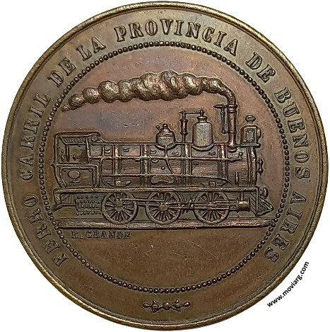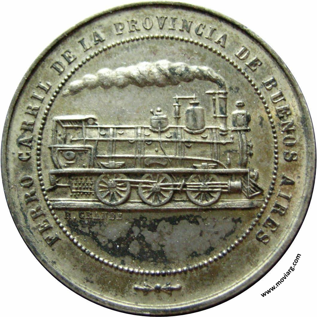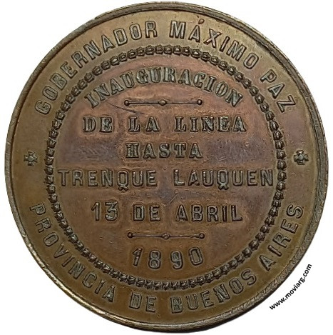 Anverso: FERRO CARRIL DE LA PROVINCIA DE BUENOS AIRES. Firma: R. GRANDE Reverso: GOBERNADOR MAXIMO PAZ / PROVINCIA DE BUENOS AIRES. INAUGURACION / DE LA LINEA / HASTA / TRENQUE LAUQUEN / 13 DE ABRIL / 1890 Referencia: ROSA-352/125 FERRARI-180 (RG) | |