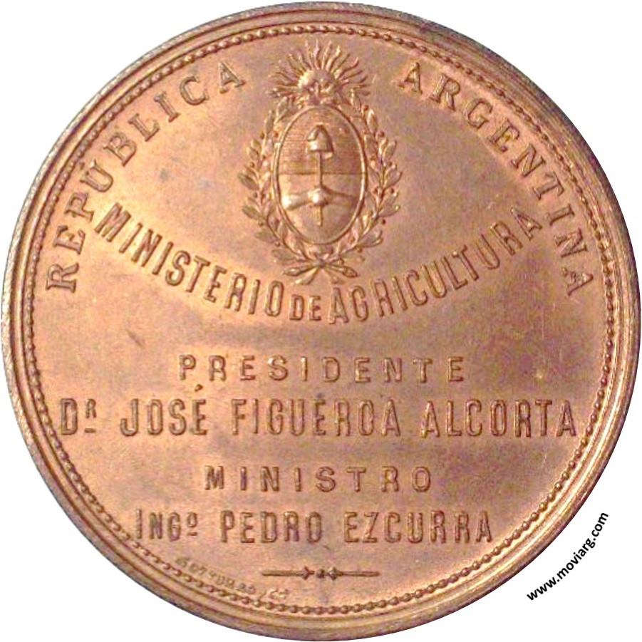 Anverso: OFICINA DE AGRONOMIA / CONCURSO DE TRIGOS / 1907 - 1908 Reverso: REPÚBLICA / ARGENTINA / MINISTERIO DE AGRICULTURA / PRESIDENTE / DR. JOSÉ FIGUEROA ALCORTA / MINISTRO / ING. PEDRO EZCURRA. Firma: GOTTUZZO Y CA. Referencia: | |