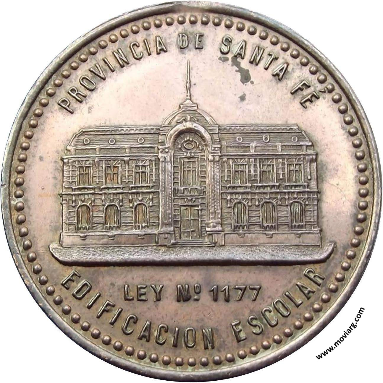 Anverso: PROVINCIA DE SANTA FÉ / EDIFICACION ESCOLAR / LEY N° 1177 Reverso: CASA CENTRAL / DE LAS / ESCUELAS PÚBLICAS / DE ROSARIO / GOBERNADOR / DR. RODOLFO FREYRE / MINISTRO DE / INSTRUCCION PÚBLICA / DR. JULIAN V. PERA / 8 MAYO 1904 Referencia: | |