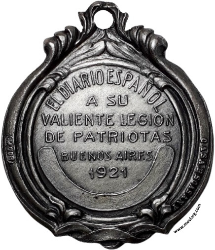 Anverso: Reverso: EL DIARIO ESPAÑOL / A SU / VALIENTE LEGION / DE PATRIOTAS / BUENOS AIRES / 1921. Firma: CASA ESCASANY. Exergo: 800M Referencia: | |