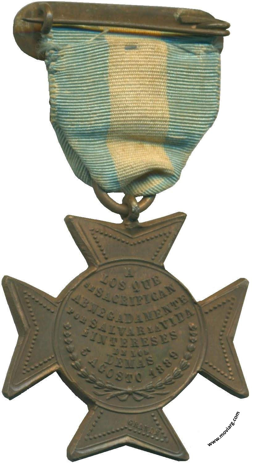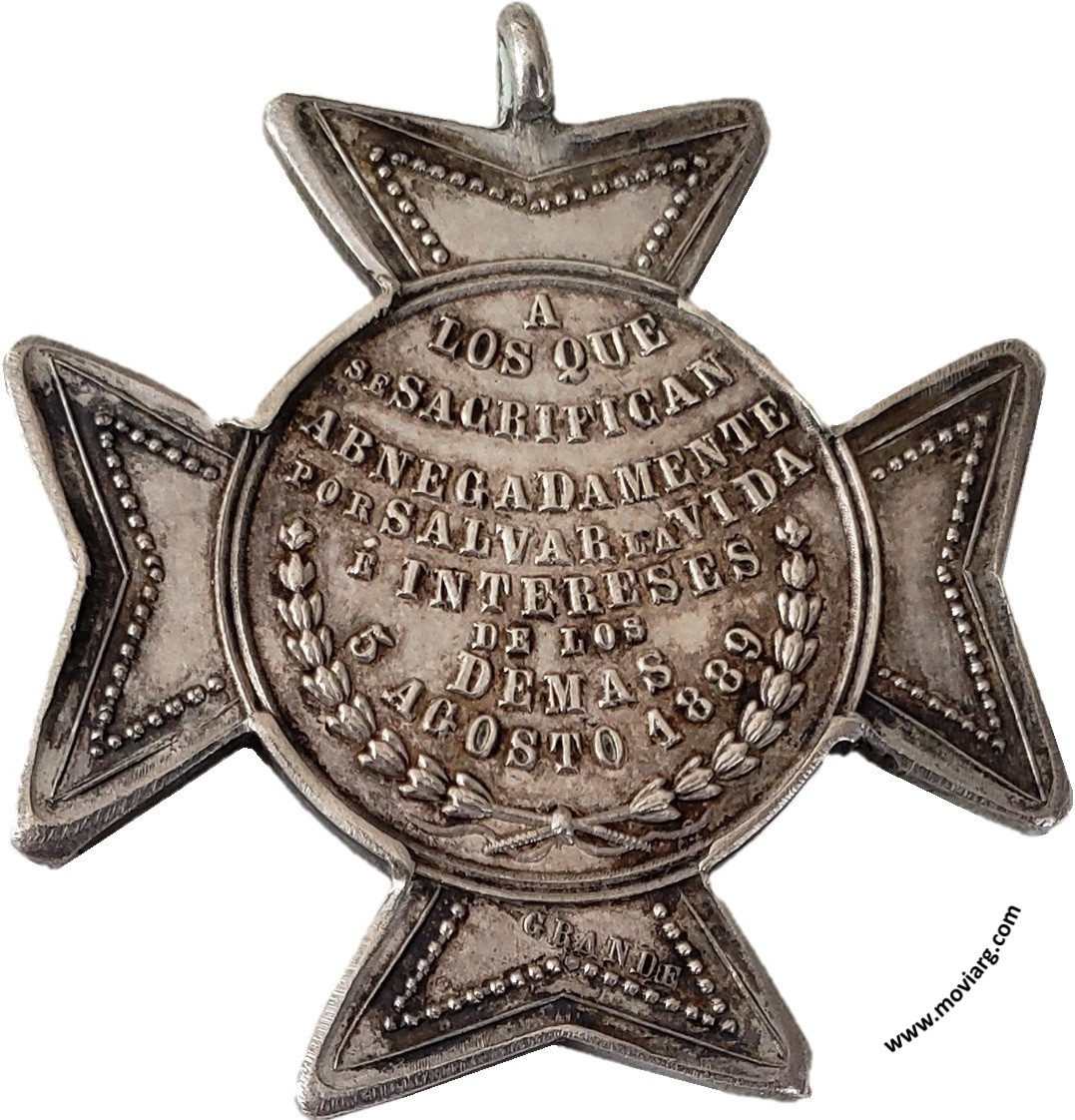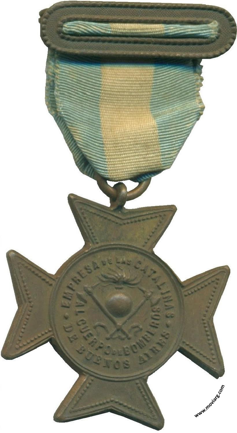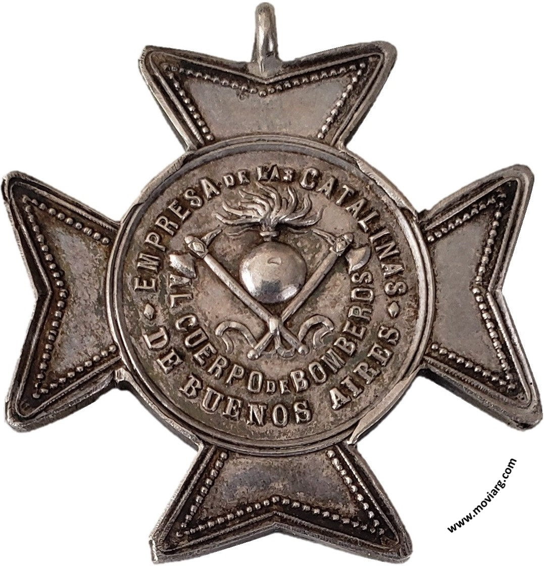 Anverso: EMPRESA DE LAS CATALINAS / AL CUERPO DE BOMBEROS / DE BUENOS AIRES Reverso: A / LOS QUE / SE SACRIFICAN / ABNEGADAMENTE / POR SALVAR LA VIDA / É INTERESES / DE LOS / DEMAS / 5 AGOSTO / 1889. Firma: GRANDE Referencia: ROSA-494 FERRARI-162 (RG) | |