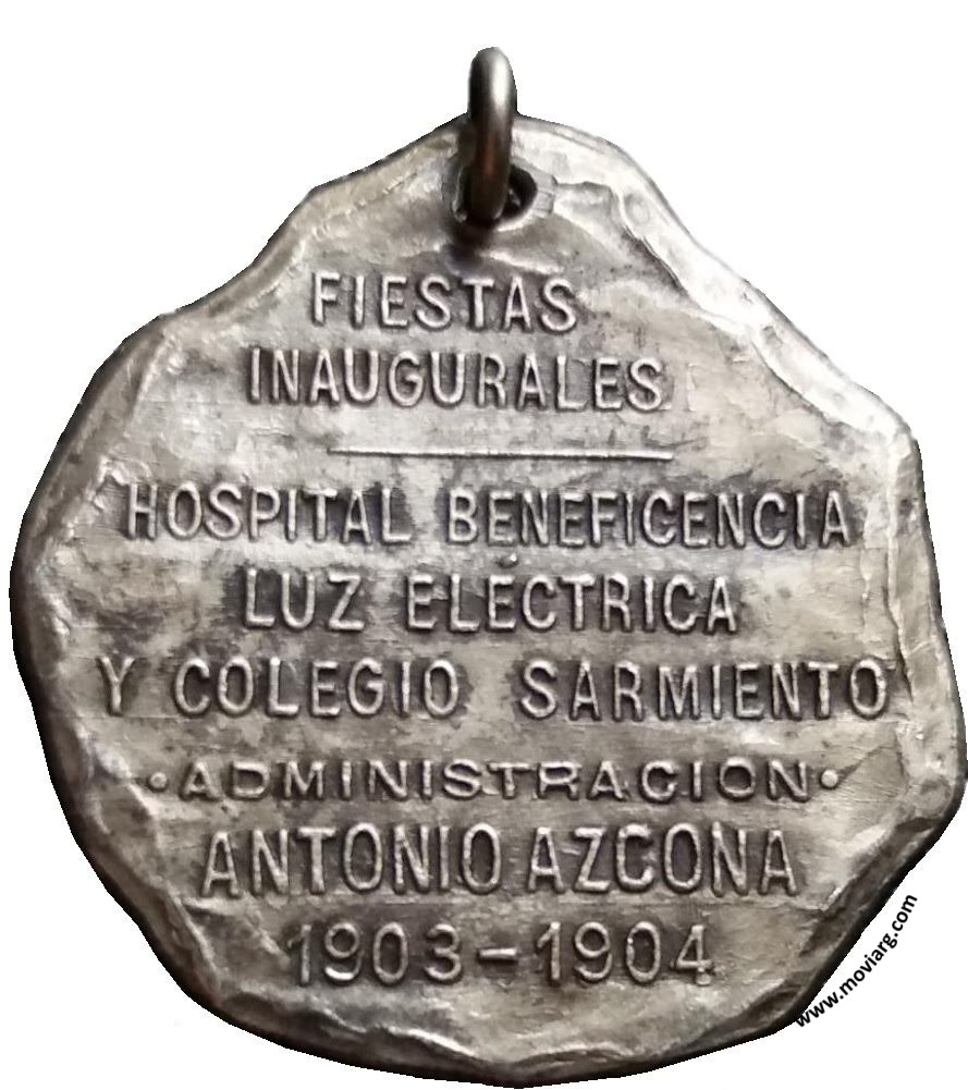 Anverso: 24 JULIO 1904. Firma: BELLAGAMBA Y ROSSI Reverso: FIESTAS / INAUGURALES / HOSPITAL BENEFICENCIA / LUZ ELÉCTRICA / Y COLEGIO SARMIENTO / ADMINISTRACION / ANTONIO AZCONA / 1903 - 1904 Referencia: PEHUAJÓ-12 (RT) | |