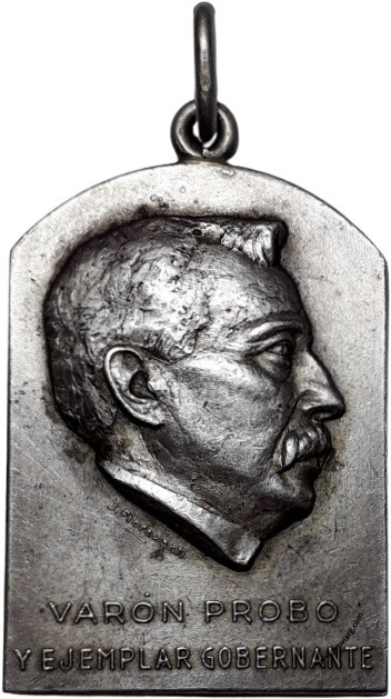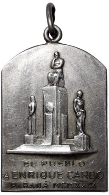 Anverso: VARÓN PROBO / Y EJEMPLAR GOBERNANTE. Firma: J. FIORAVANTI Reverso: EL PUEBLO / A ENRIQUE CARBÓ / PARANÁ MCMXXIX Canto: Liso. PLATA Referencia: | |