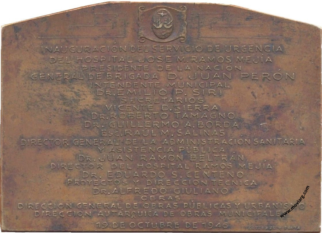 Anverso: MCMXLVI Reverso: INAUGURACIÓN DEL SERVICIO DE URGENCIA / DEL HOSPITAL JOSE M. RAMOS MEJÍA / PRESIDENTE DE LA NACIÓN / GENERAL DE BRIGADA D. JUAN PERÓN / INTENDENTE MUNICIPAL / DR. EMILIO P. SIRI / SECRETARIOS / VICENTE D. SIERRA / DR. ROBERTO TAMAGNO / DR. GUILLERMO A. BORDA / ESC. RAÚL M. SALINAS / DIRECTOR GENERAL DE LA ADMINISTRACIÓN SANITARIA / Y ASISTENCIA PÚBLICA / DR. JUAN RAMON BELTRÁN / DIRECTOR DEL HOSPITAL RAMOS MEJÍA / DR. EDUARDO S. CENTENO / PROYECTOS Y DIRECCION TECNICA / DR. ALFREDO GIULIANO / OBRAS / DIRECCION GENERAL DE OBRAS PÚBLICAS Y URBANISMO / DIRECCION AUTÁRQUICA DE OBRAS MUNICIPALES / 19 DE OCTUBRE DE 1946. Firma: GOTTUZZO Y PIANA Referencia: | |