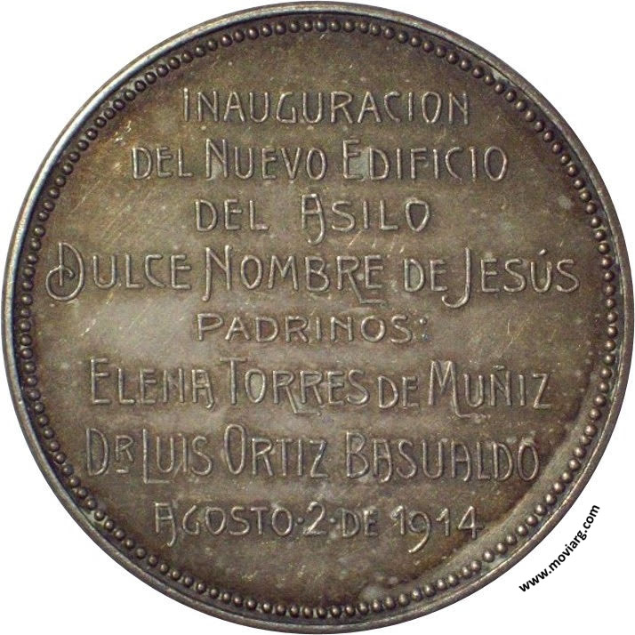 Anverso: Firma: GOTTUZZO Y CA. Reverso: INAUGURACION / DEL NUEVO EDIFICIO / DEL ASILO / DULCE NOMBRE DE JESÚS / PADRINOS: / ELENA TORRES DE MUÑIZ / DR. LUIS ORTIZ BASUALDO / AGOSTO 2 DE 1914 Canto: Humberto Burzio: "Buenos Aires en la medalla" 1981 p1021. Referencia: BURZIO-3232 | |