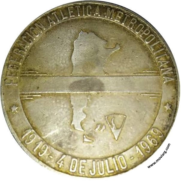 Anverso: 50° ANIVERSARIO. Campo: A / FAM Reverso: FEDERACION ATLETICA METROPOLITANA / 1919 - 4 DE JULIO - 1969 Referencia: | |