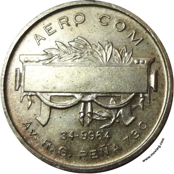 Anverso: AVIONES / PIPER CUB Reverso: AERO COM / AV. R. S. PEÑA 730 / 34-9964 Canto: Humberto Burzio: "Buenos Aires en la medalla" 1981 p302. Referencia: BURZIO-899 | |