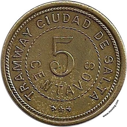 Anverso: TRAMWAY CIUDAD DE SALTA / 5 / CENTAVOS Reverso: FABA. NACL. DE MEDALLAS / ORZALI, BELLAGAMBA Y CA. - BS. AS. / AGENTE / M. NUÑEZ DE LA ROSA Referencia: MORUCCI-27 | |