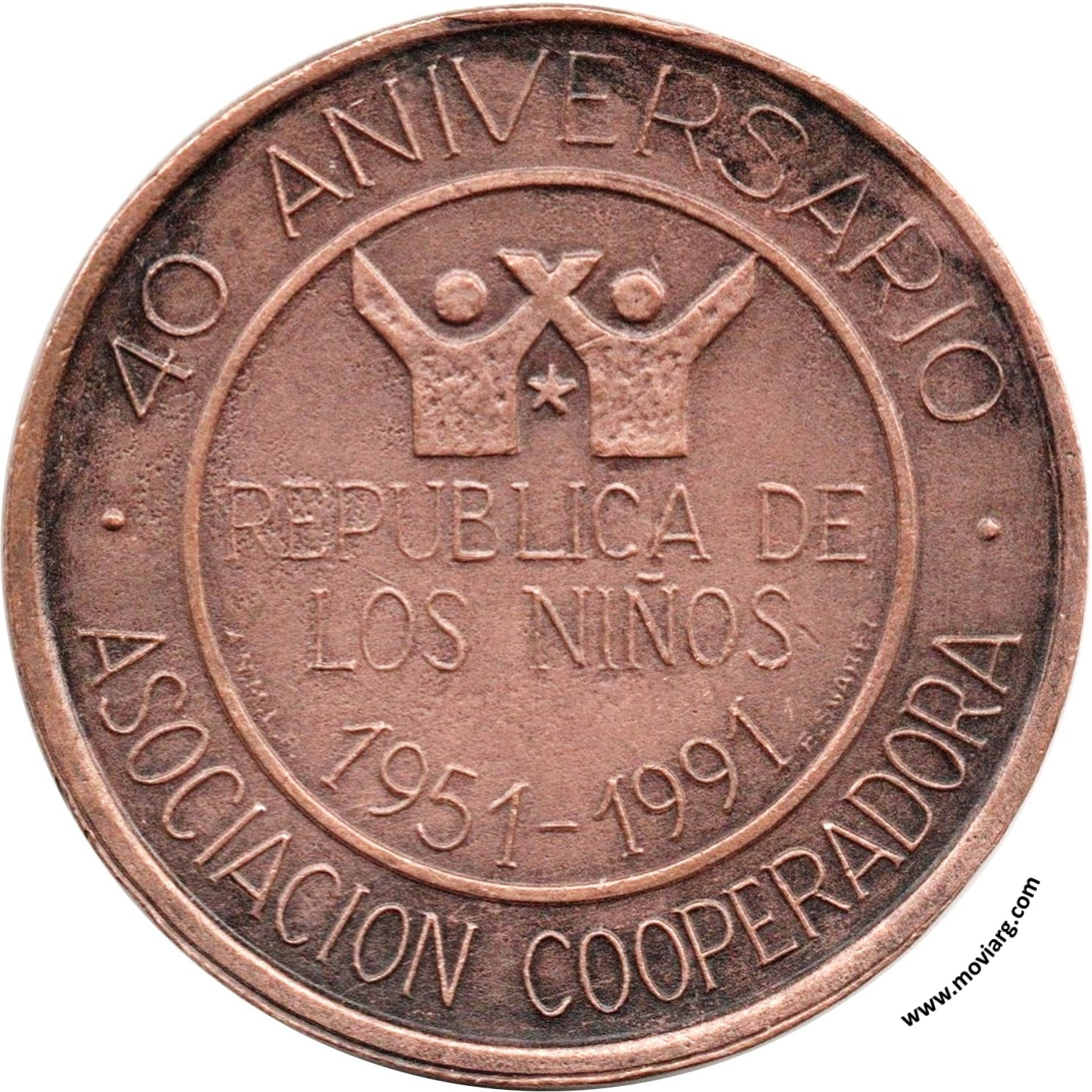 Anverso: MUNICIPALIDAD DE LA PLATA. Firma: E. SUAREZ / A.N.M.L.P. Reverso: 40 ANIVERSARIO / ASOCIACION COOPERADORA / REPUBLICA DE / LOS NIÑOS / 1951 - 1991. Firma: A.N.M.L.P. / E. SUAREZ Referencia: | |