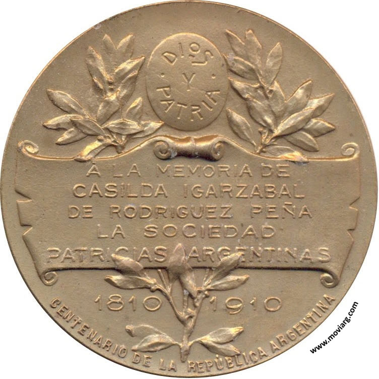 Anverso: 1774 / 1844. Firma: C. Y AF. ROSSI Reverso: DIOS / Y / PATRIA / Á LA MEMORIA DE / CASILDA IGARZABAL / DE RODRIGUEZ PEÑA / LA SOCIEDAD / PATRICIAS ARGENTINAS / 1810 1910 / CENTENARIO DE LA REPÚBLICA ARGENTINA Referencia: | |