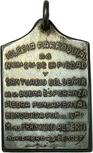 Anverso: Reverso: IGLESIA PARROQUIAL / DE / NTRA. SRA. DE LA PIEDAD / Y / SANTUARIO DEL SEÑOR / DE LA BUENA ESPERANZA / PIEDRA FUNDAMENTAL / BENDECIDA POR EL ILMO. / MONS. FRANCISCO ALBERTI / NOVIEMBRE 20 DE 1927 Referencia: | |