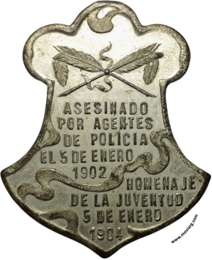 Anverso: AL / INFATIGABLE / DEFENSOR Y / PROPAGANDISTA / DE LA REDENCION / POLÍTICA / Y DE LAS LIBERTADES / PÚBLICAS / JOSÉ F. ECHEVARRIA. Firma: BELLAGAMBA Y ROSSI Reverso: ASESINADO / POR AGENTES / DE POLICIA / EL 5 DE ENERO / 1902 / HOMENAJE / DE LA JUVENTUD / 5 DE ENERO / 1904 Referencia: | |