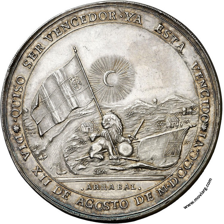 Aureo & Calicó Anverso: A SU REI CARLOS IIII LA LEALTAD DE BUENOS AIRESReverso: QUISO SER VENCEDOR YA ESTA VENCIDO / DIA XII DE AGOSTO DE MDCCCVI. Firma: Arrabal Referencia: BURZIO-5357 | |