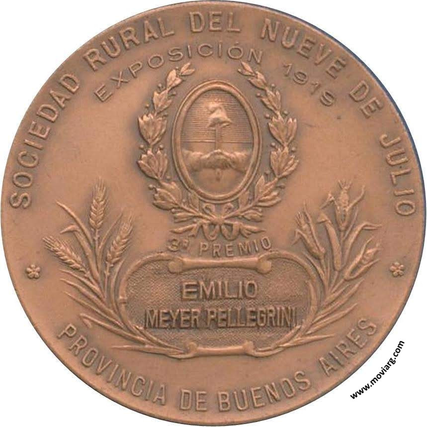 Anverso: SOCIEDAD RURAL DEL NUEVE DE JULIO / EXPOSICIÓN 1919 / 3R. PREMIO / PROVINCIA DE BUENOS AIRES. Campo: [ EMILIO / MEYER PELLEGRINI ] Reverso: Firma: BELLAGAMBA / Y ROSSI Referencia: | |