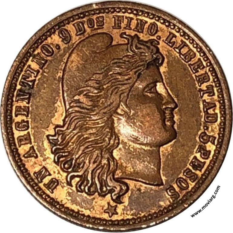 Anverso: UN ARGENTINO. 9 DOS. FINO. LIBERTAD. 5 PESOS Reverso: Referencia: | |